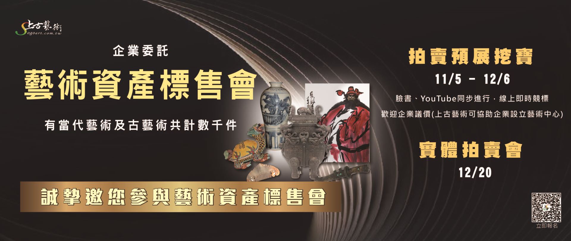 拍賣預展將於 11月5日至12月6日 ,現場直接開標,上古藝術也將同步於 Facebook、YouTube 平台進行線上展示與即時競標。全台藏家可隨時線上出價、遠端參與,無需親臨現場即可搶先入手心儀藏品。